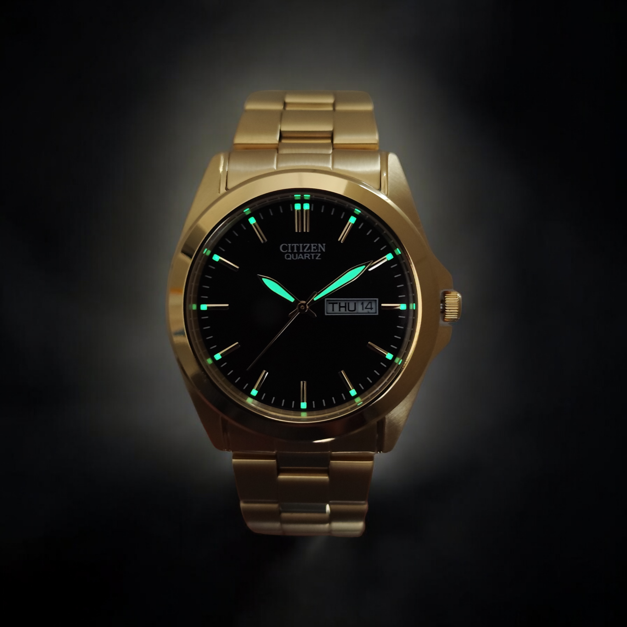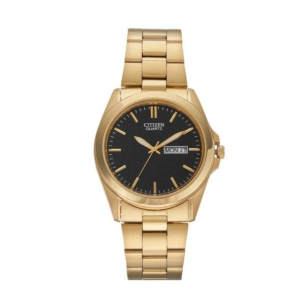 Classic 39.5 mm men’s gold-tone watch with black dial, day/date function, luminous markers, and quartz movement.