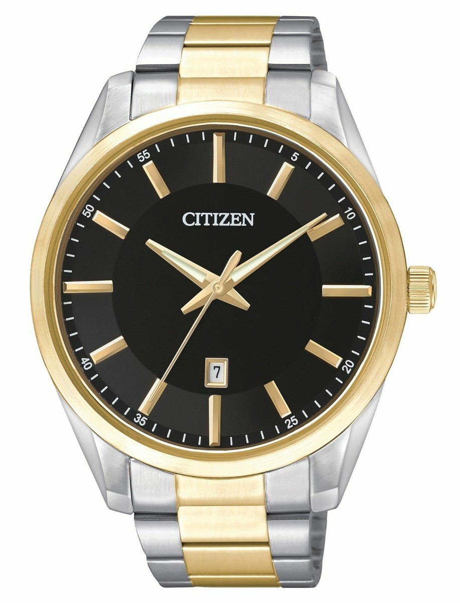 Citizen BI1034-52E is a men’s analog watch with a stainless steel case, black dial, luminous markers, red accents, quartz movement, and 50m water resistance.