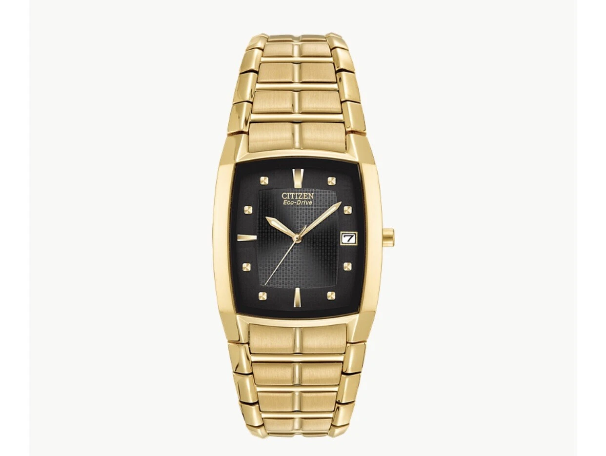 Elegant men’s watch featuring a black dial with luminous hands, gold-tone stainless steel case, and Eco-Drive technology.