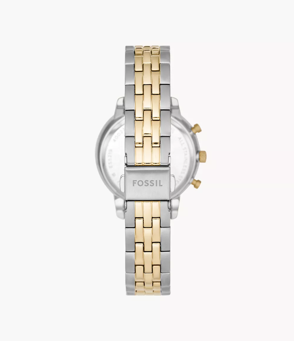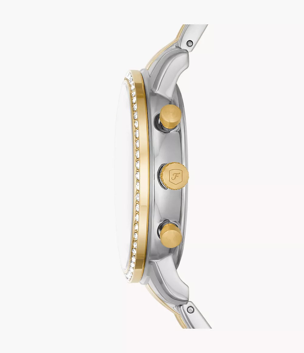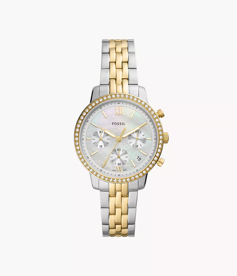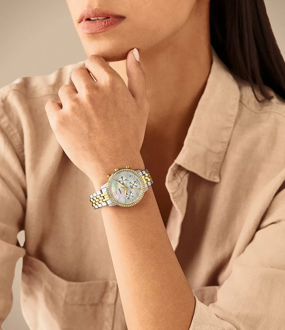 A beautiful two-tone Fossil watch with a mother-of-pearl dial, crystal accents, and chronograph design — perfect for any occasion.