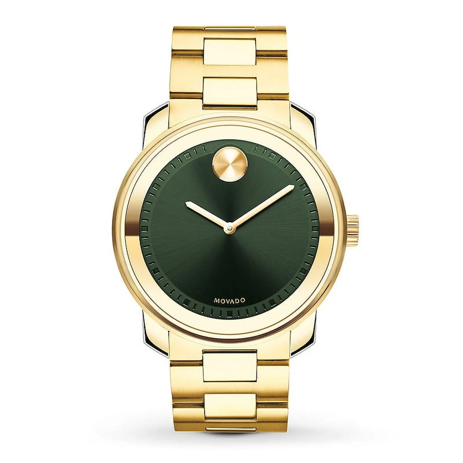 Movado Bold Green Dial Men’s Watch – 43mm gold-tone stainless steel case and bracelet, green Museum dial with iconic flat dot, Swiss quartz movement, scratch-resistant K1 crystal, water-resistant up to 30 meters