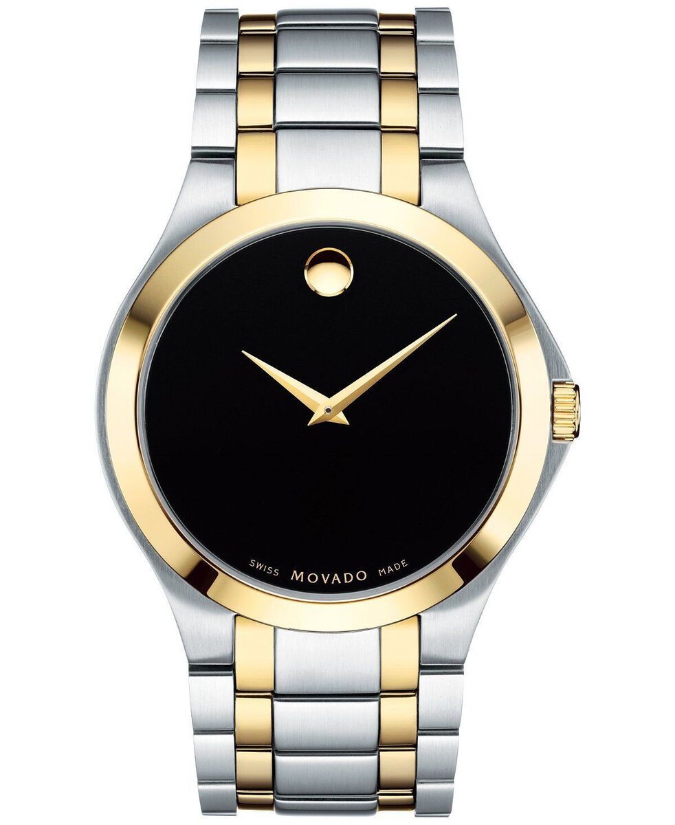 Movado Collection 40 mm two-tone stainless steel watch with black Museum dial, Swiss quartz, sapphire or K1 crystal, and 30 m water resistance.