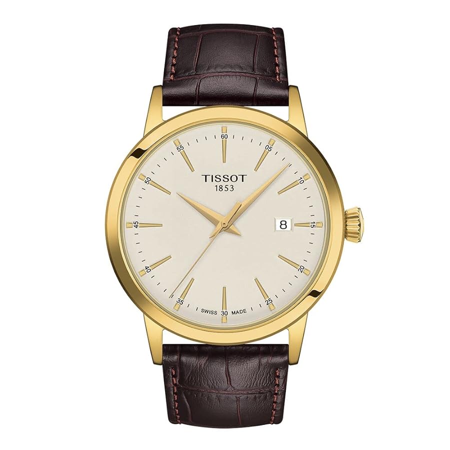 Classic men’s dress watch with 42 mm gold-PVD stainless steel case, ivory dial, Swiss quartz movement, date window, sapphire crystal, and brown leather strap.