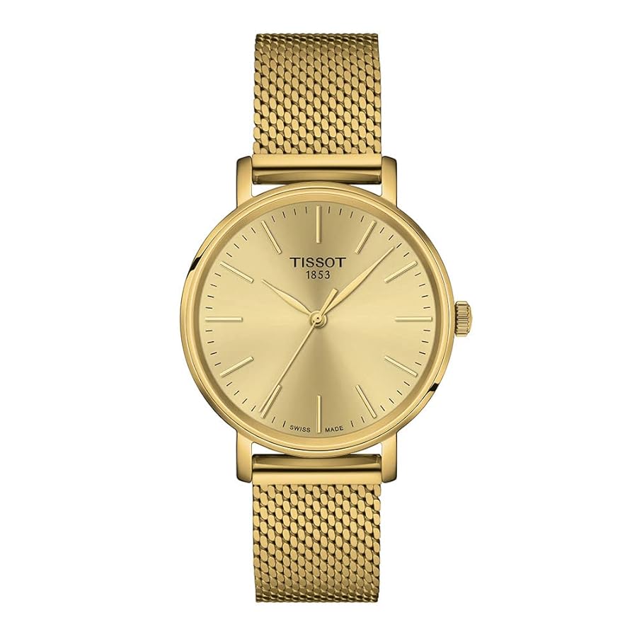 Tissot Everytime Lady T143.210.33.021.00 – 34 mm gold-PVD quartz watch, champagne sunray dial, sapphire crystal, quick-release bracelet, 50 m water resistant.