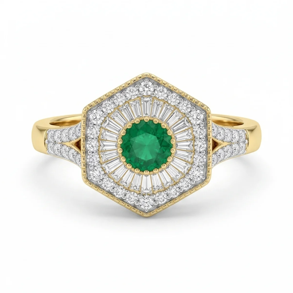 Yellow 14k Emerald Ring With 0.55tw Round Shape Emerald and 0.29tw Round Shape Diamond and 0.47tw Trapeze Shape Di